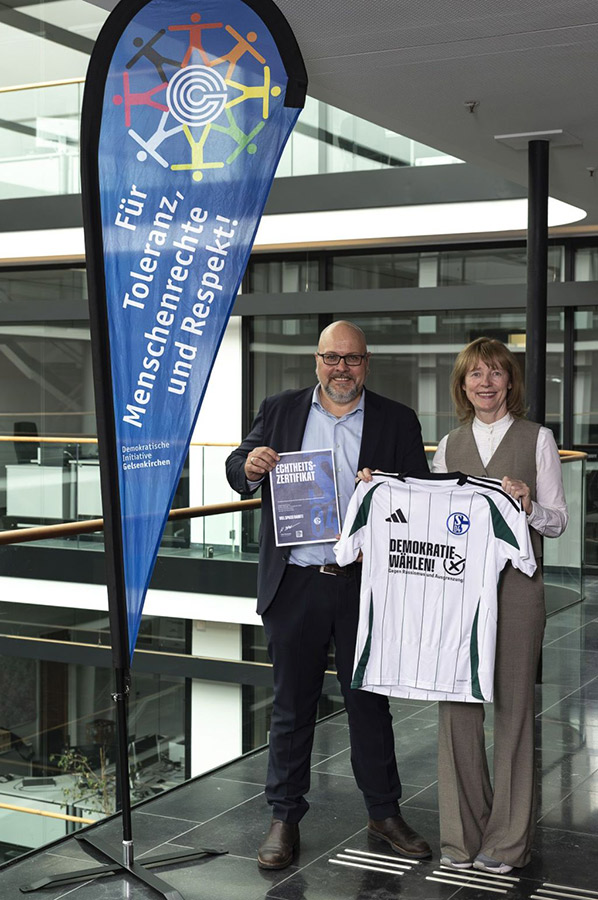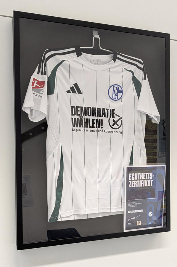 Dieses Trikot trug der FC Schalke 04 am Bundestagswahl 2025. Es ist ein eindrucksvolles Bekenntnis für die Demokratie und gegen Extremismus. Die Botschaft ist zeitlos. Der Demokratischen Initiative Gelsenkirchen wurde das Trikot von der Stiftung Schalke hilft! geschenkt - als Anerkennung für ihr langjähriges Engagement.